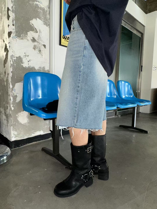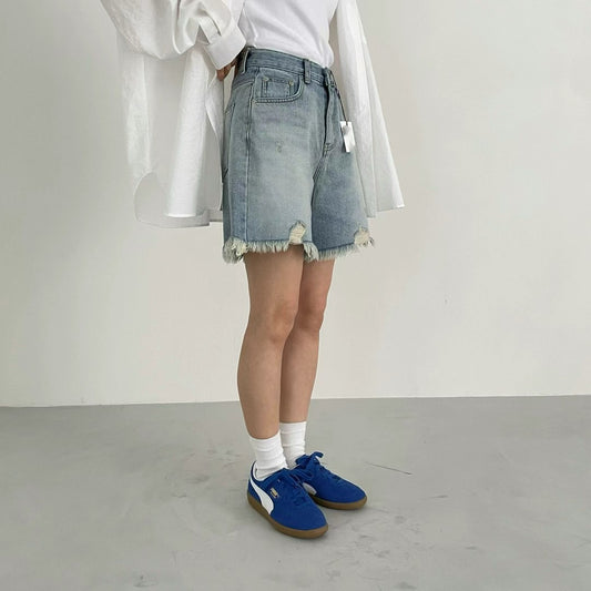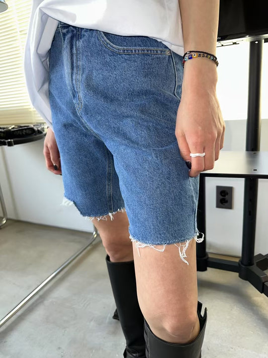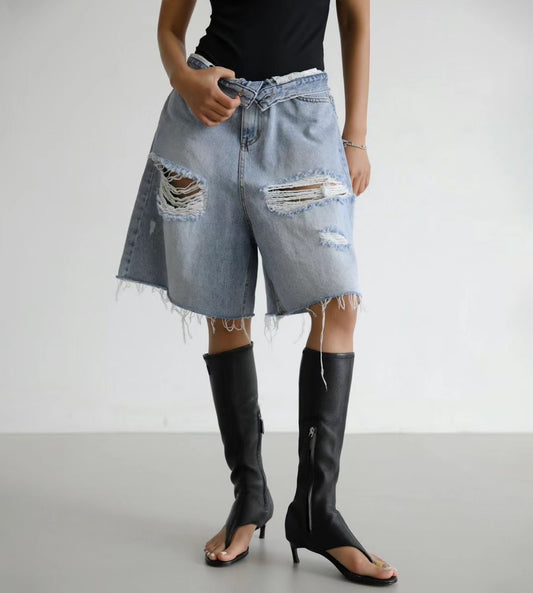 RIPPED KNEE LENGTH DENIM SHORTS